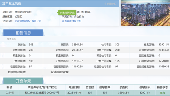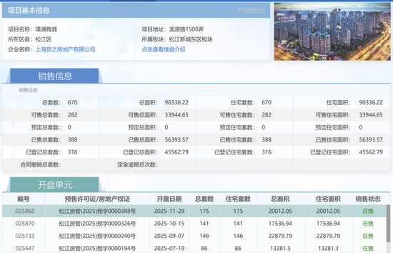 海屿佘山位于松江佘山板块,2025年累计开盘2次,共推出425套住宅,已销售195套,销售率45.9%。